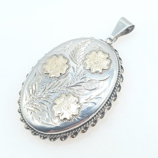Vintage Sterling Silver Large Oval Locket Gold Highlight Flowers Rope Border Keepsake Gift Pendant Necklace Womens Unisex Jewelry Jewellery