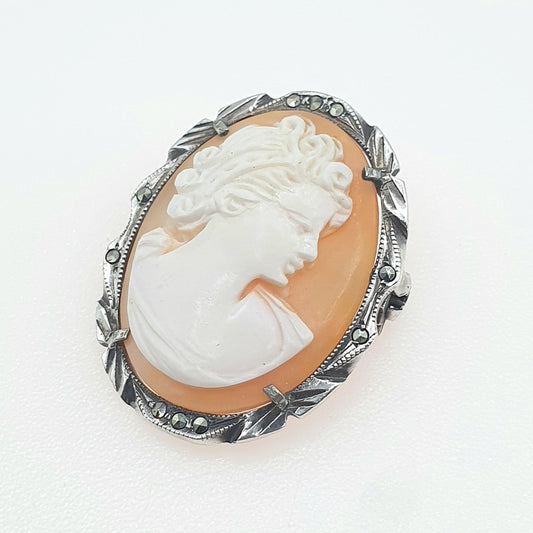 Old Vintage Solid Silver Cameo Pendant Brooch Necklace Marcasite 1950’s Hand Carved Shell Unisex Jewelry Womens Jewellery