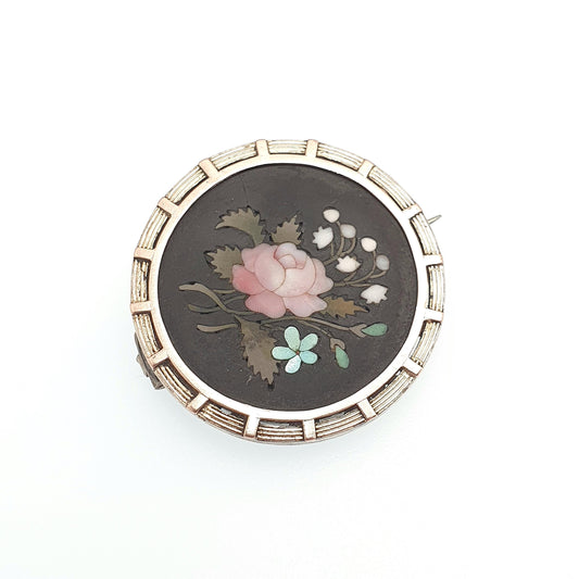 Antique Solid Silver Pietra Dura Brooch Gold Vermeil Gemstone Mosaic Italian Handmade Pin Vintage Womens Jewellery Jewelry