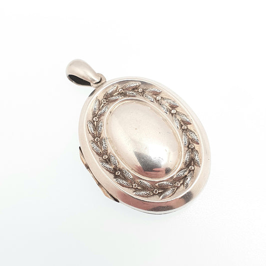Antique Victorian Solid Silver Locket Wreath Leaf Border Big Large Oval Pendant Picture Photo Vintage 1800s Jewelry Jewellery
