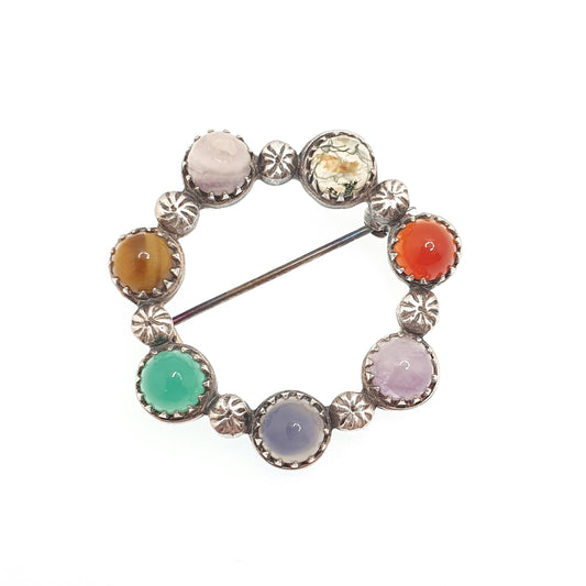 Vintage Sterling Silver Gemstone Brooch ROBERT ALLISON 1961 Scottish Celtic Moss Agate Chrysoprase Tiger Eye Solid 925 Jewelry Jewellery