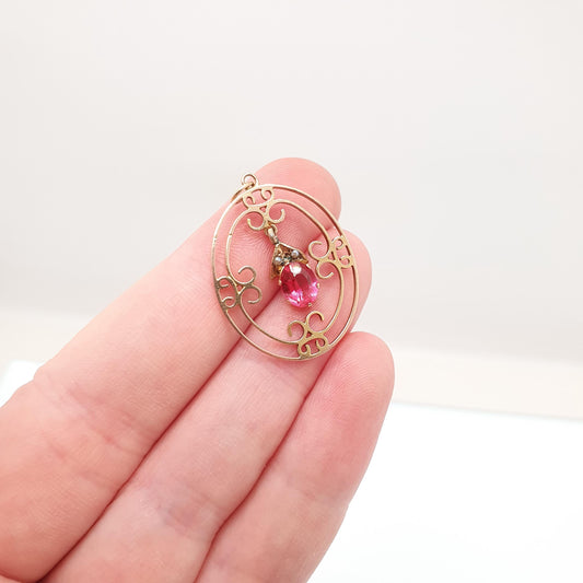 Antique 9ct Gold Pink Tourmaline Necklace Pendant Solid 9kt 9k Openwork Art Nouveau Seed Pearl Vintage Jewelry Jewellery