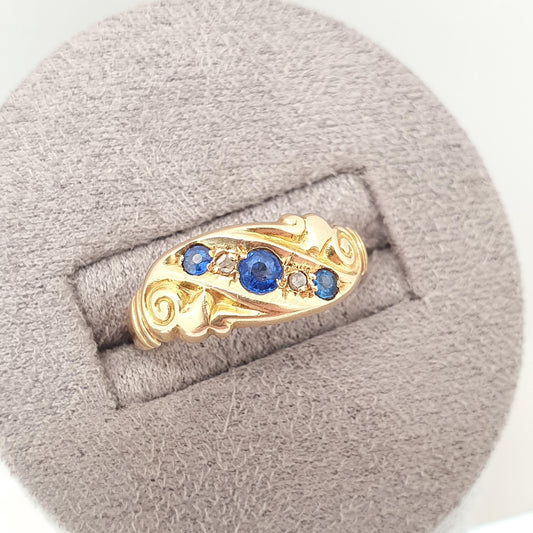 Antique 18ct 18k Gold Diamond & Sapphire Ring Solid 750 1916 Hallmark Scroll Five Gemstone Vintage Jewelry Jewellery