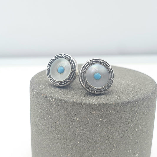 Antique Victorian Solid Silver Rim Turquoise Glass Earrings Mother of Pearl Stud Womens Round Vintage Ladies Jewellery Jewelry