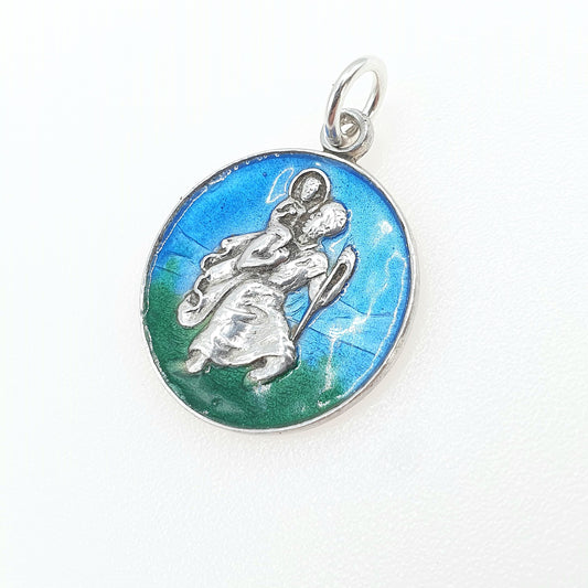 Vintage Sterling Silver Enamel St Christopher Pendant Blue and Green Travel Travelling Patron Womens Mens Jewellery Jewelry