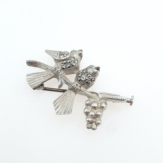 Antique Art Deco Solid Silver Bird Brooch Pair of Songbirds Grape Grapevine Marcasite Birds Womens Jewelry Jewellery