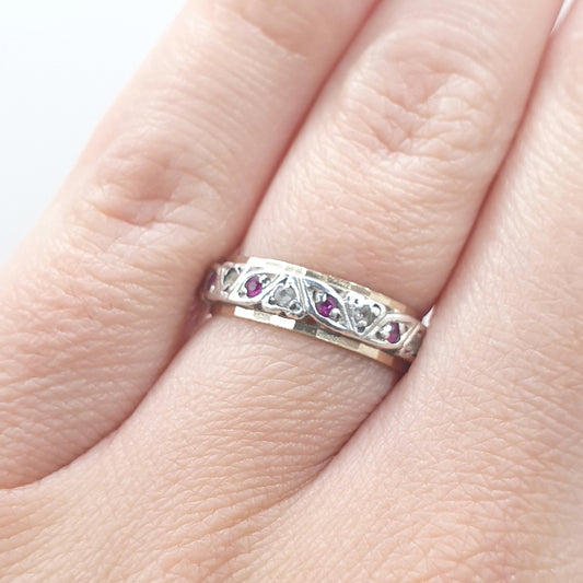 Antique Art Deco 9ct Gold & Solid Silver Ruby Eternity Ring White Spinel Gift Womens Jewellery Jewelry UK J.5 US 5