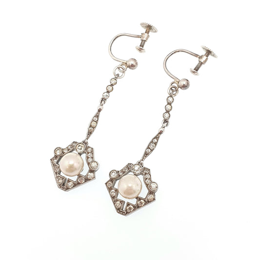 Antique Solid Silver Diamond Paste Earrings Art Deco Simulated Pearl Chandelier Dangling Drop Geometric Hanging Vintage Jewelry Jewellery