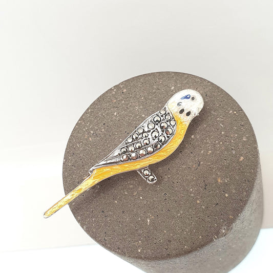 Antique Sterling Silver Budgie Brooch Enamel Bird Marcasite Art Deco Yellow Parakeet Vintage Ladies Womens Jewelry