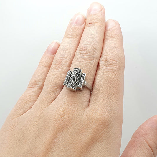 Antique Art Deco Solid Silver Marcasite Ring Geometric Cocktail Flapper Jewelry Jewellery Womens Mens UK O US 7.25