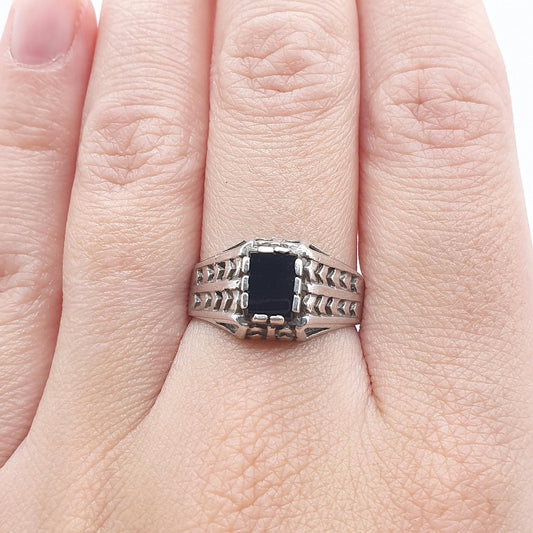 Vintage Solid Silver Onyx Signet Ring Arrow Shoulders Unisex Black Gemstone Mens Womens Jewelry Jewellery