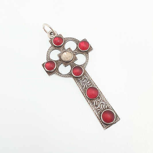 Antique Victorian Solid Silver Celtic Cross Pendant Garnet Paste Necklace Christian Hand Engraved Irish Gaelic Large Jewelry Jewellery