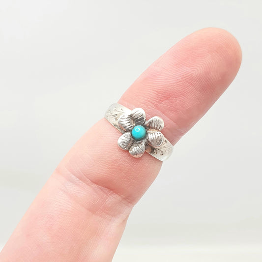 Antique Victorian Solid Silver Turquoise Ring Forget Me Not Natural Gemstones Flower Floral Signet Vintage 1800s Rare Genuine Jewelry