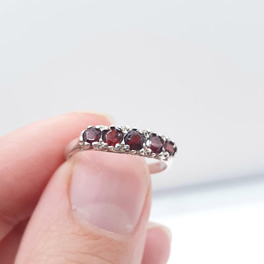 Vintage Sterling Silver Garnet Gypsy Ring Red Gemstone 5 Stone 1990s Retro Womens Jewellery Jewelry