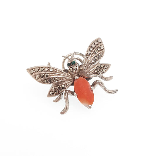 Antique Solid Silver Fly Brooch Pin Coral Marcasite 1920s Art Deco Vintage 1800s Bug Insect Wings Gemstone Rare Womens Jewelry Jewellery
