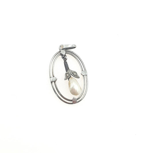 Antique Silver Tone Base Metal Freshwater Pearl and Marcasite Pendant Edwardian Vintage Womens Jewellery Jewelry