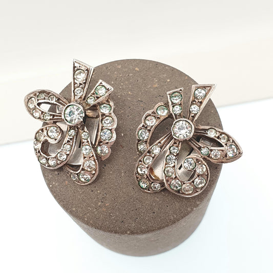 Antique Art Deco Solid Silver Bow Earrings Diamond Paste 1920s Clip On Flapper Cocktail Vintage Sparkly Jewelry Jewellery