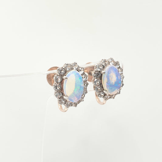 Antique Victorian Opal 9k 9ct Gold Earrings Translucent White Sapphire Cluster Halo Solid Silver Set Oval Cut Vintage Jewelry Jewellery