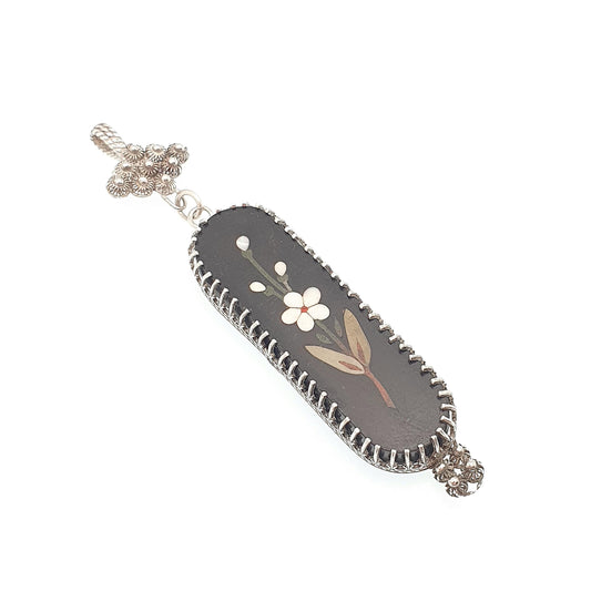 Antique Victorian Sterling Silver Pietra Dura Necklace Pendant Large Marble Flower Mosaic Solid 925 1800s Vintage Womens Jewellery Jewelry