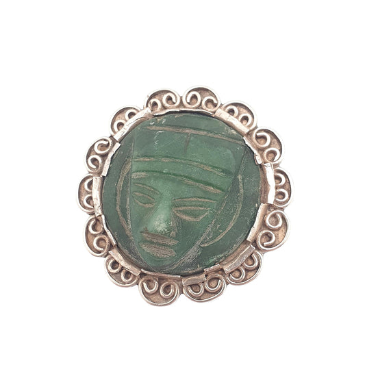 Old Vintage Solid Silver Pharoah Brooch Fluorite Cameo Handmade Egyptian Egypt Large Big Green Hardstone Authentic Womens Jewelry Jewellery