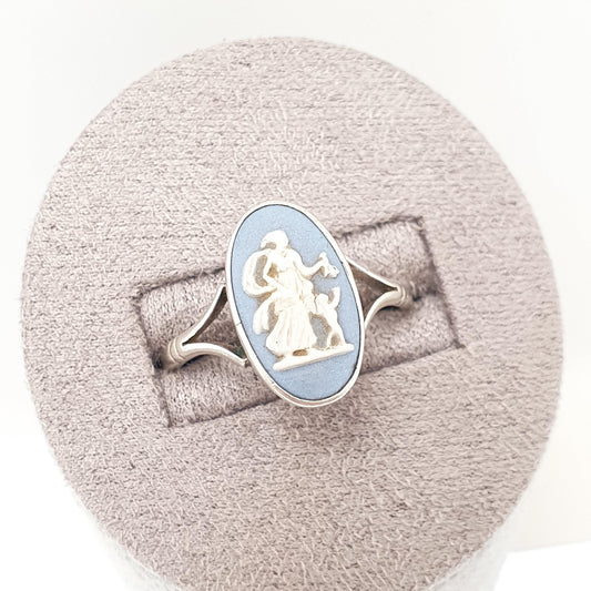 Old Vintage Sterling Silver Wedgwood Ring Sky Blue Jasperware Cameo Signet Genuine Josiah Wedgwood Women Ladies Retro Jewelry Jewellery