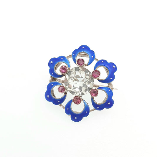 Antique Sterling Silver White Spinel Brooch Amethyst & Blue Enamel Victorian Flower Genuine Natural Gemstone Vintage