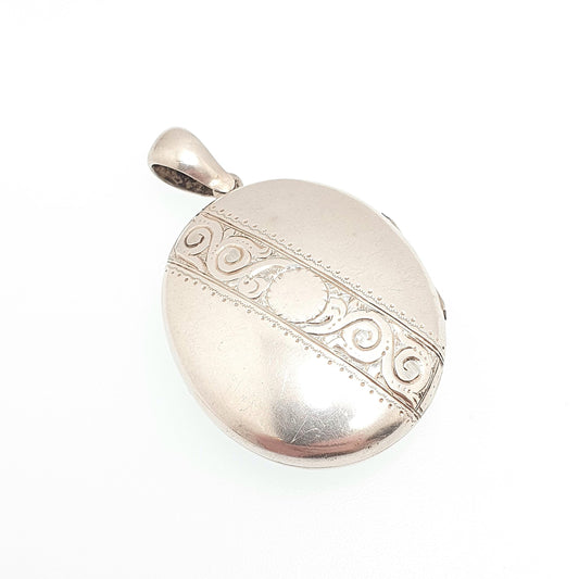 Antique Victorian Solid Silver Locket Hand Engraved Band Oval Large Big Pendant Picture Photo Vintage Womens Jewelry Jewellery