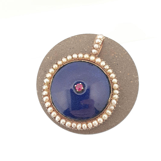 Antique 14k 14kt Gold Ruby Locket Seed Pearl Blue Enamel Victorian Solid Rose Gold 585 Round Circle Vintage Jewelry Jewellery