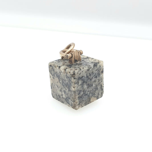 Antique 9ct 9k Gold Aberdeenshire Granite Pendant Fob Necklace Square Cube Grey Scottish Charm Hardstone Jewelry Jewellery