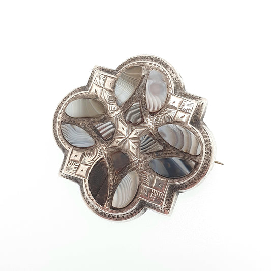 Antique Victorian Sterling Silver Montrose Lace Agate Brooch Scottish Star Shape Grey Banded Scotland 1800s Vintage Womens Jewelry Jewellery