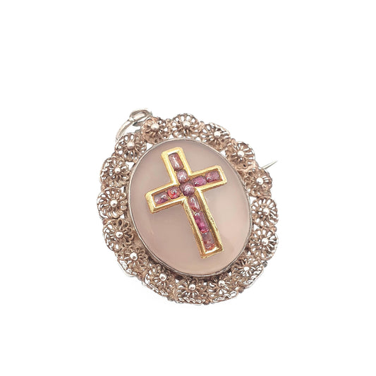 Antique Georgian 18ct Gold Ruby Crucifix Pendant Brooch Necklace Solid Silver Filigree White Chalcedony Gemstone Womens Jewelry Jewellery