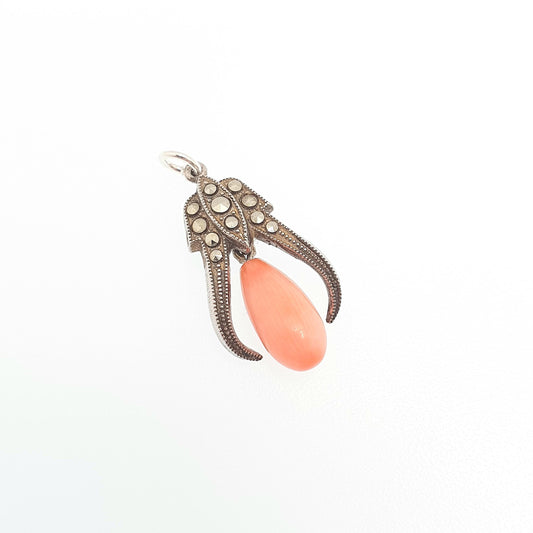 Antique Natural Coral Necklace Sterling Silver Pendant Art Deco Marcasite Womens Vintage Teardrop Jewellery Jewelry