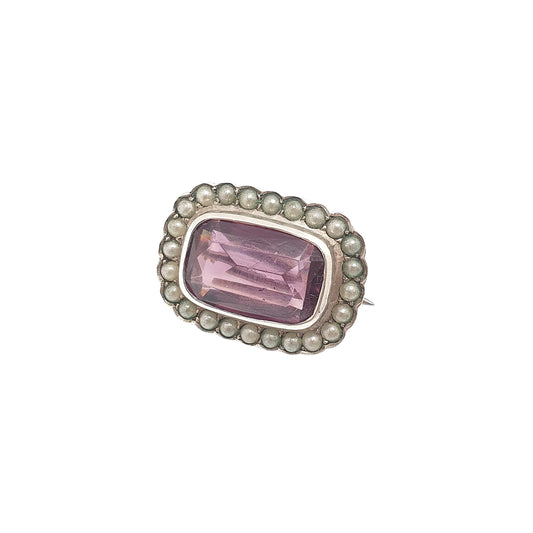 Antique Solid Silver Amethyst Paste Brooch Victorian Seed Pearl Rectangular 1800s Vintage Womens Jewelry Jewellery