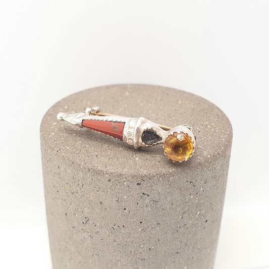 Antique Scottish Dirk Sterling Silver Brooch Pin 1911 Citrine Paste Cairngorm Gaelic Kilt Agate Jasper Vintage Scotland Jewellery Jewelry