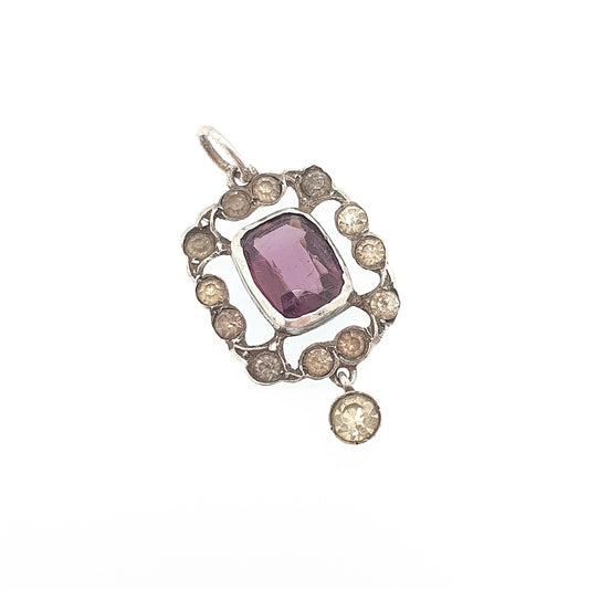 Antique Solid Silver Amethyst & Diamond Paste Pendant Necklace Foiled Pastes Cluster Edwardian Rare Vintage Womens Jewellery Jewelry