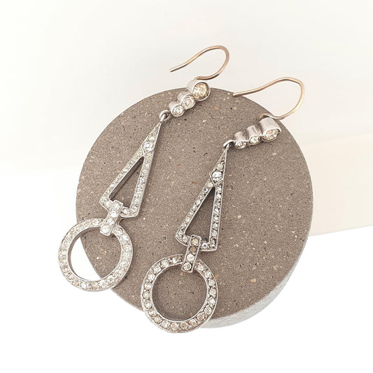 Antique 9ct Gold Diamond Paste Earrings Solid Silver Hook Dangling Drop Art Deco Geometric Chandelier Triangle Vintage Jewelry Jewellery