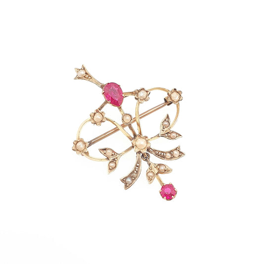 Antique 14k 14kt Gold Ruby Necklace Seed Pearl Openwork Pendant Brooch Edwardian Solid 585 Art Nouveau Vintage Womens Jewelry Jewellery