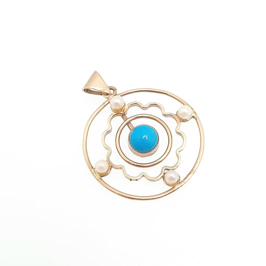 Antique Turquoise 9ct 9k Gold Pendant Necklace Seed Pearl Target Openwork Edwardian Lavaliere Gemstone Solid 375 Vintage Jewellery Jewelry