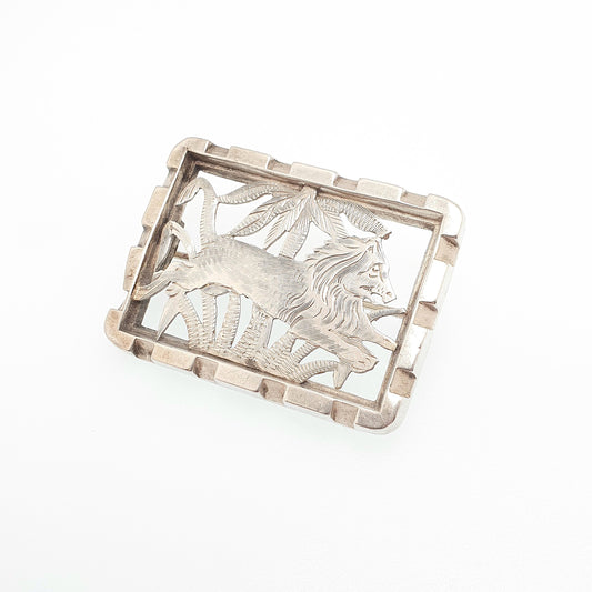 Antique Solid Silver Lion Brooch Victorian Pin Asian Aesthetic Jungle Palm Tree Exotic 1800s Big Cat Vintage Womens Jewelry Jewellery