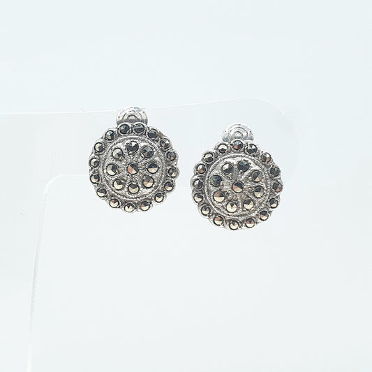 Antique Art Deco Solid Silver Star Earrings Marcasite Dome Clip On 1920s Flapper Womens Ladies Jewelry Jewellery
