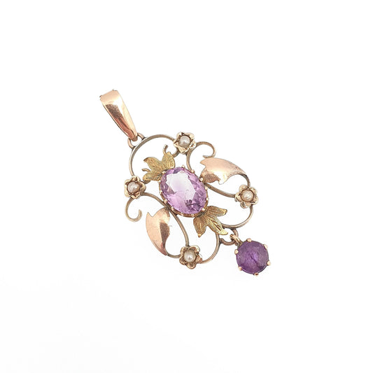 Antique 9ct Gold Amethyst Seed Pearl Pendant Necklace Brooch Edwardian Solid 375 Openwork Art Nouveau Vintage Jewellery Jewelry