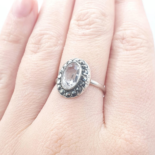 Antique Rock Crystal Solid Silver Ring Art Deco Marcasite Cluster Halo Clear White Quartz Gemstone Genuine Cocktail Jewellery Jewelry