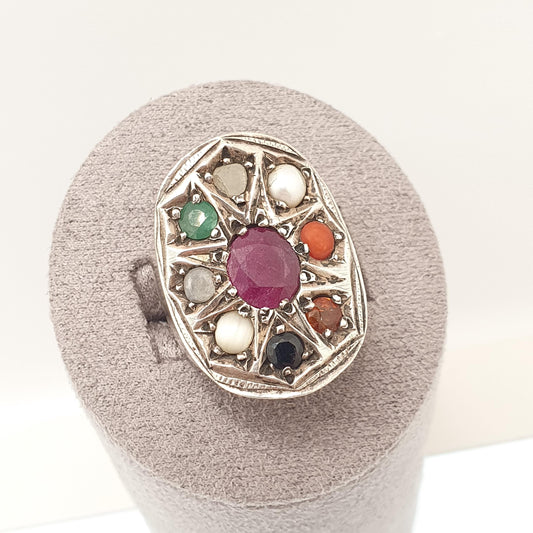 Vintage Sterling Silver Navaratna Ring Multi Gemstone Ruby Emerald Sapphire Thai Thailand Ratnas Topaz Citrine Large Cluster Vintage Jewelry