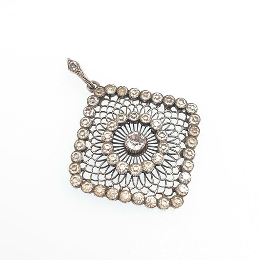 Antique Solid Silver Diamond Paste Pendant Dreamcatcher Web Spiral Necklace Large Square Art Deco Sparkly Vintage Womens Jewellery Jewelry