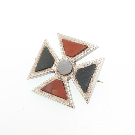 Antique Victorian Solid Silver Maltese Cross Brooch Pin Scottish Montrose Lace Agate Bloodstone Cruciform Crucifix 1800s Jewelry Jewellery