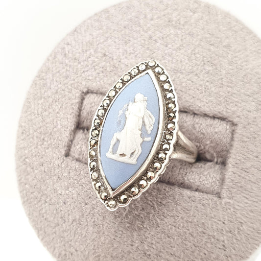 Antique Solid Silver Wedgwood Ring Art Deco Marcasite Large Blue Jasperware Genuine Josiah Vintage Big Handmade 1800s Jewellery Jewelry