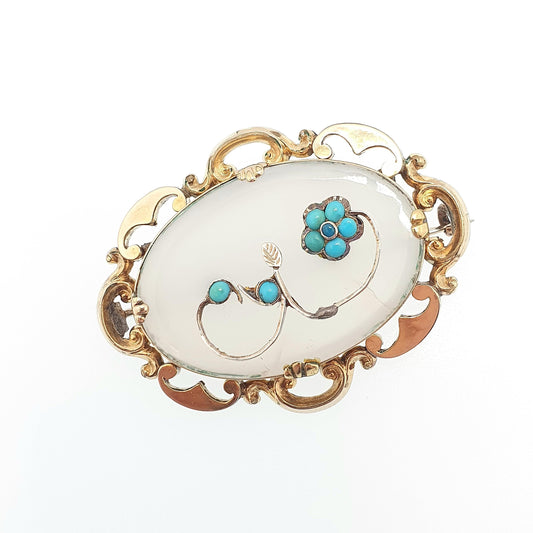 Antique Victorian 9ct Gold Cased Turquoise Brooch Forget Me Not White Chalcedony Quartz Flower Leaf Vintage Womens Jewelry Jewellery