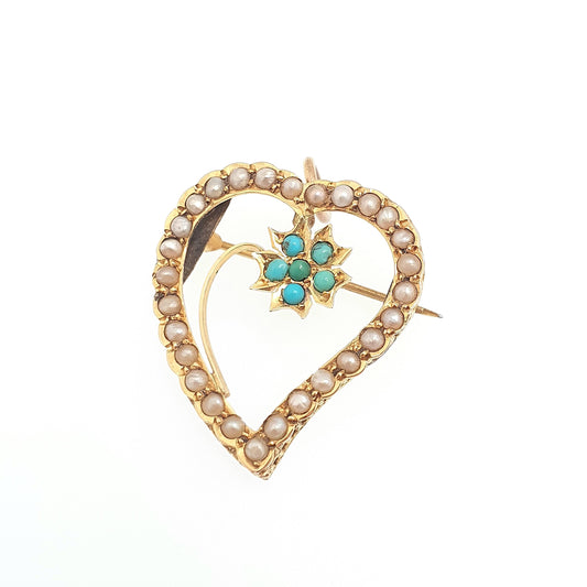 Antique Victorian 9ct 9k Gold Turquoise Witch's Heart Pendant Seed Pearl Forget Me Not Brooch Pin Solid 9kt Necklace Jewelry Jewellery