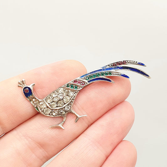 Antique Sterling Silver Peacock Brooch Diamond Paste Enamel Exotic Bird Edwardian Vintage Animal Birds Sparkly Womens Jewelry Jewellery