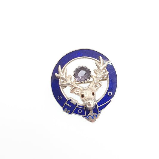 Antique Sterling Silver Stag Brooch Blue Enamel 1915 Hallmark Buckle Amethyst Paste Adie Lovekin Scottish Deer Vintage Jewelry Jewellery